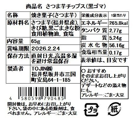 さつま芋チップス【黒ゴマ】は、より皆さまに楽しんでいただき、東尋坊の中で製造した商品であること。東尋坊限定商品として、お客様に、美味しく、健康的にお召し上がりいただければとの思いで、三田国際科学学園の中学生達(2025J3)が、考案してくれた商品です!